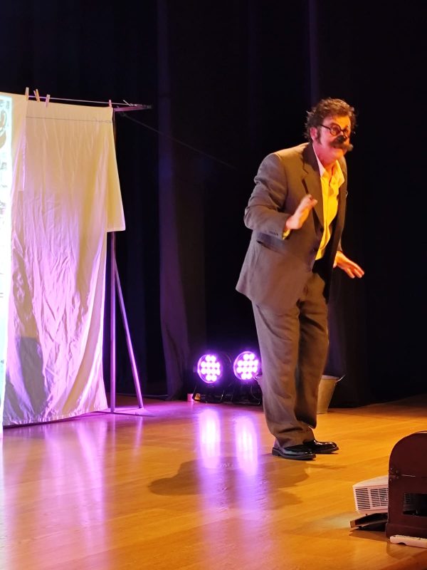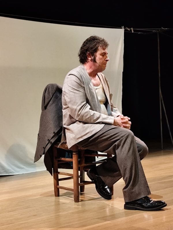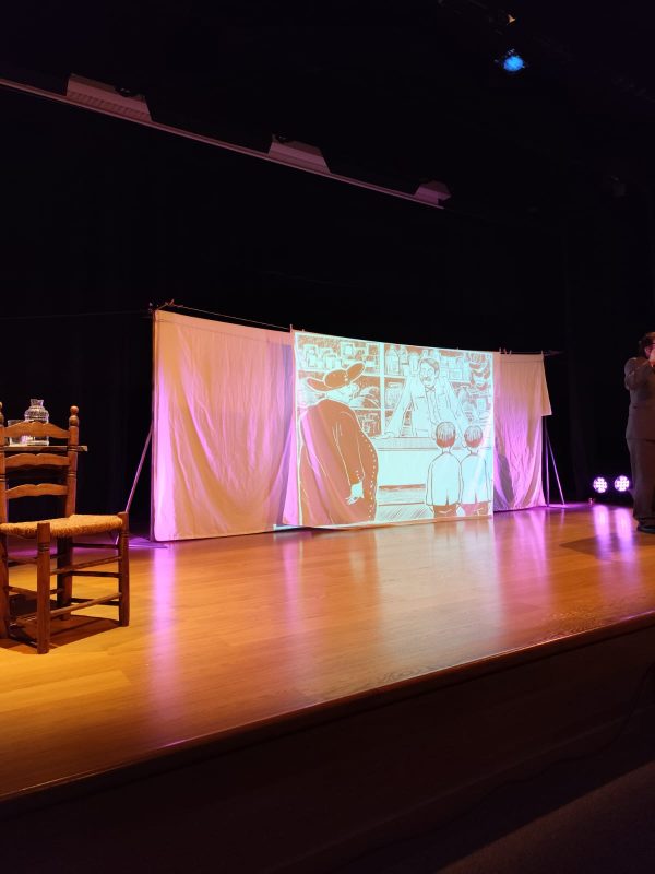 El siguiente hito en nuestra andadura de 2026 fue una obra de teatro: «Ramón Acín, pajaricos en la cabeza», que pudimos disfrutar en el edificio principal del Centro Cívico Rio Ebro, en la calle María Zambrano. Un espectáculo multimedia, que supone un auténtico reto personal para el actor que, en solitario, lleva todo el peso de la obra Javier Tríllo y Alfonso Palomares son sus autores y, este último, es quien da vida al personaje que nos muestra este espectáculo. Nos aproximan a la figura de Ramón Acín, un desconocido para mucha gente, que influyó en los ambientes políticos los años 20 y 30 desde su militancia anarquista. Fue asesinado por los fascistas en 1936 acabando también con la vida de su compañera Concha Monrás, no pudiendo ocultar, sin embargo, un inmenso legado de obras, desde inventos pedagógicos, a esculturas, pinturas, artículos, caricaturas y un largo etcétera que, aún así, palidece ante la propia figura humana de esa gran persona que fue Ramón Acín.