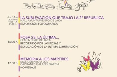 Lunes, 12 de diciembre Lugar: JACA 16,00 h. Cementerio de Jaca, Recorrido por las Fosas y Explicación de la última exhumación 17,30 h. Monumento a los capitanes Galán y García, Homenaje MEMORIA A LOS MÁRTIRES 20,30 h. Palacio de Congresos de Jaca, Documental de Pepe Viyuela UN VIAJE HACIA NOSOSTROS 22,00 h. Restaurante La Cadiera, CENA REPUBLICANA (previa reserva) … Sigue leyendo 92 aniversario de la Sublevación de Jaca