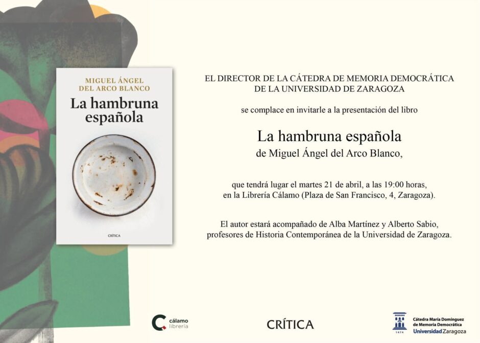 El acto, organizado por la Cátedra de Memoria Democrática de la Universidad de Zaragoza, contará con la participación directa del autor, Miguel Ángel del Arco Blanco. En este encuentro, el autor entablará una conversación con Alba Martínez y Alberto Sabio, ambos profesores de Historia Contemporánea de la Universidad de Zaragoza, para profundizar en el contenido de la obra y el contexto histórico que aborda.