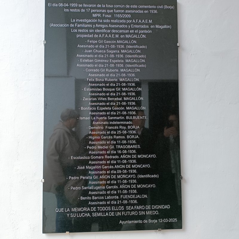 El 12 de marzo de 2025, se descubrió una placa en el cementerio de Borja con los nombres de los 17 asesinado y posteriormente en el auditorio, levantado sobre las ruinas de la iglesia mudéjar de Santa María de la Huerta, de Magallón, se entregaron los restos, identificados, a los familiares, los no identificados reposan en el panteón del cementerio de Magallón de AFAAEM, asociación impulsora de la iniciativa.