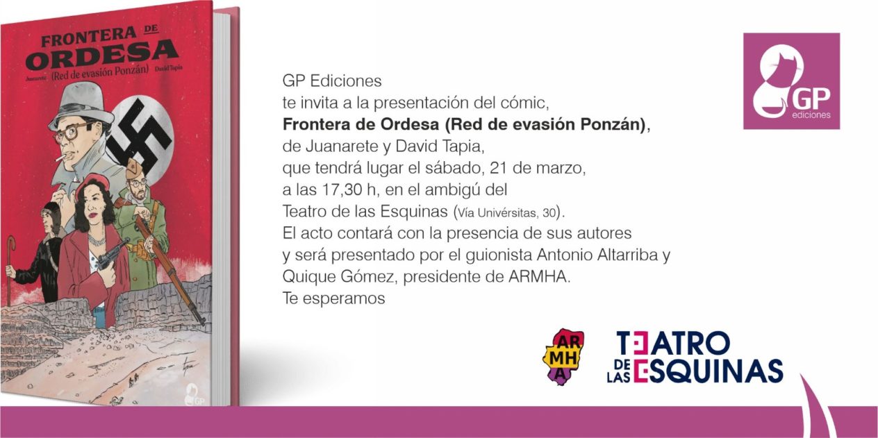Presentación del cómic, Frontera de Ordesa (Red de evasión Ponzan) de GP Ediciones CUANDO: El sábado, 21 de marzo, a las 17,30 horas DONDE: en el ambigú del Teatro de las Esquinas (Vía Universitas, 30) Presentado por el guionista Antonio Altarriba y Enrique Gómez, presidente de ARMHA Se contará con la presencia de los autores