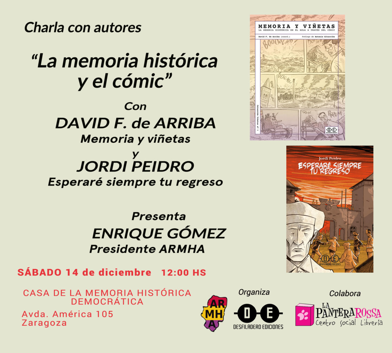 El próximo sábado, 14 de diciembre, a las 12,00 h. en nuestra sede, sita en la Avda. América, 105 (Casa de la Memoria Histórica Democrática de Zaragoza), tendra lugar un acto de presentación y charla con los autores de: «Memoria y viñetas«, con David F. de Arriba y «Esperaré siempre tu regreso» con Jordi Peidro La presentación del acto sera … Read More