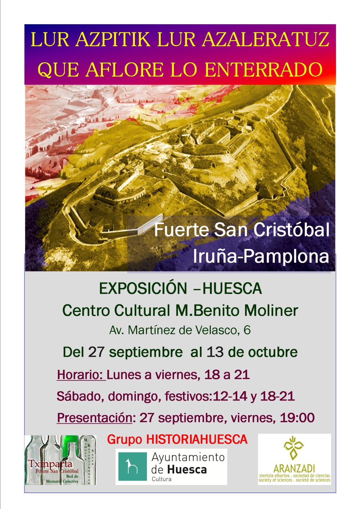 La Asociación Txinparta (Pamplona) y Grupo HistoriaHuesca, organizan distintos actos sobre el fuerte de San Cristóbal Exposición: QUE AFLORE LO ENTERRADO, ACERCA DEL «FUERTE DE SAN CRISTÓBAL» DE PAMPLONA Centro Cultural M. Benito Molina, Avda. Martínez Velasco, 6 Del 27 de septiembre al 13 de octubre Horario Lunes a Viernes de 18 a 21 Sábado, domingo y festivos de 12 … Read More