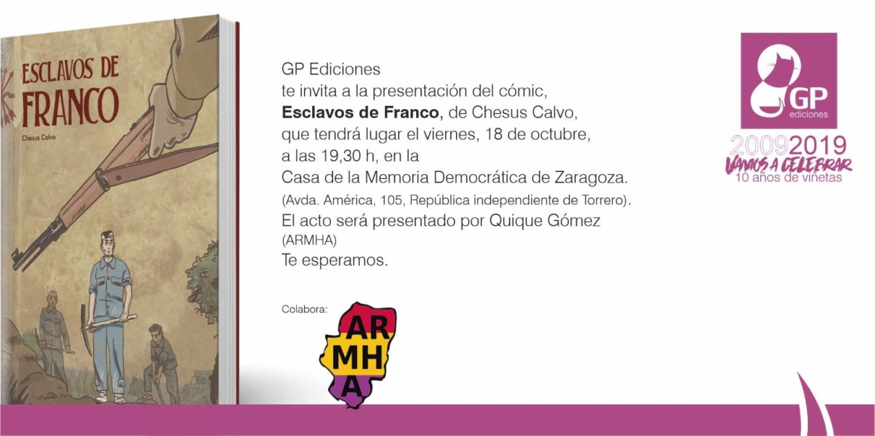 El próximo 18 de Octubre, en la Casa de la Memoria Histórica Democrática de Zaragoza, presentaremos el comic «Esclavos de Franco», prologado por Enrique Gómez Arnas, presidente de la Asociación por la Recuperación de la Memoria Histórica de Aragón. (ARMHA). Este cómic, supone una aproximación fidedigna y muy bien desarrollada al mundo de los campos de trabajo del franquismo. Los … Read More