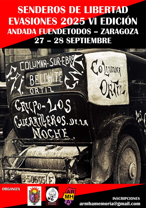 Conmemorando su gesta y por sexto año, las asociaciones AV Montes de Torrero Barrio de Venecia, Asociación Cultural El Cantero de Torrero y la Asociación por la Recuperación de la Memoria Histórica de Aragón (ARMHA), se realizará la andada la noche del 27/09/2025 desde Fuendetodos a Zaragoza